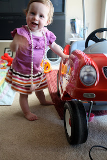 Jocelyn's current LIKES: Playing peek-a-boo, throwing balls, swinging at the park, fire engines (very unexpected), scooting/crawling forwards now (since 7/24), still dancing, taking steps holding on to mommy's hands, playing with older kids still, dogs finally (her first experience was with greyhounds and she was definitely not a fan) and "talking" about her day. OH and when the 7 day forecast comes on in the morning she goes nuts! No idea why! Cracks us UP!