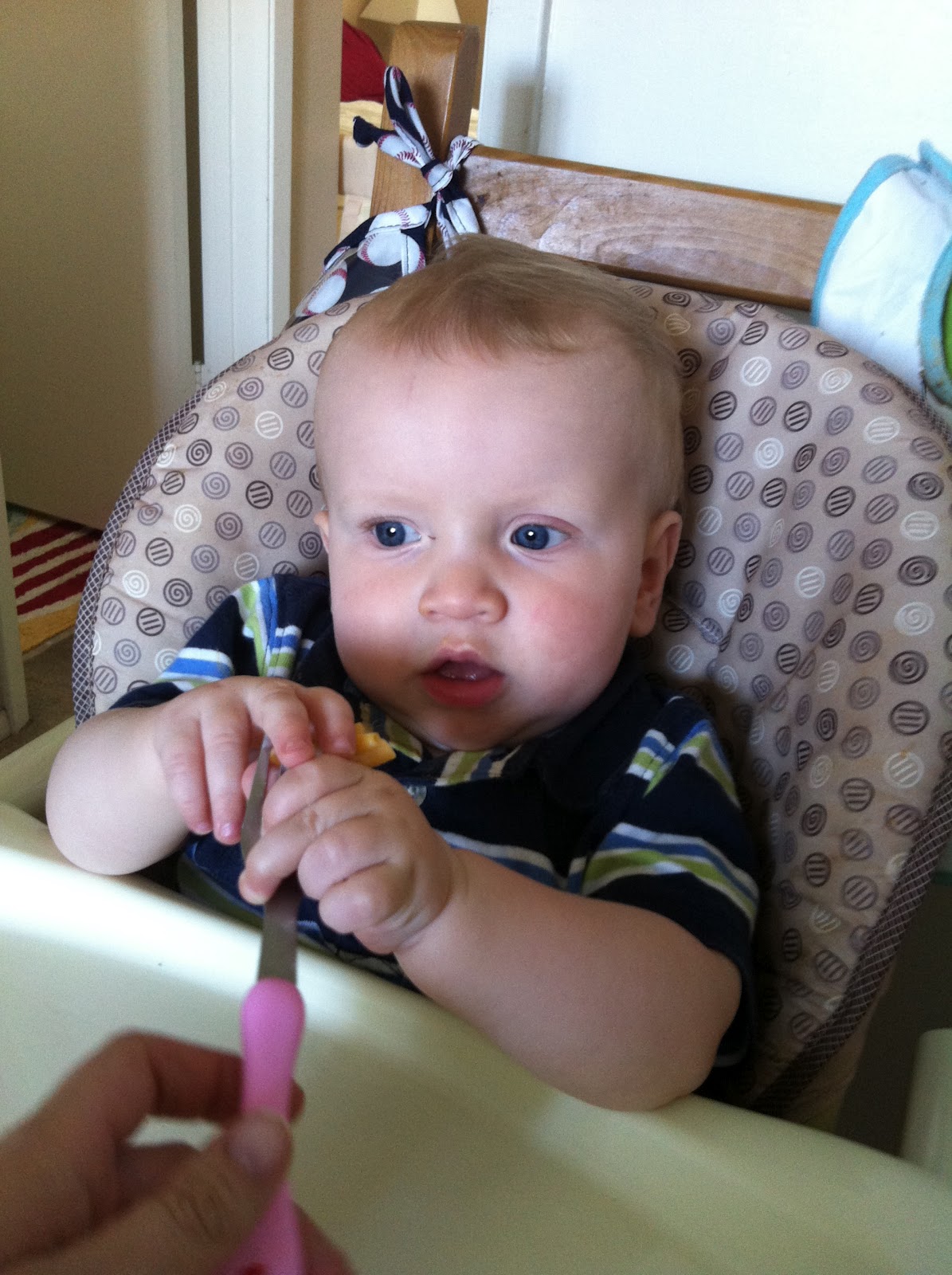 He is also really loving yogurt now too! I can't get it in his mouth fast enough! He even tries to grab the container and drink it down! Really glad he loves food but I see big grocery bills in my future!